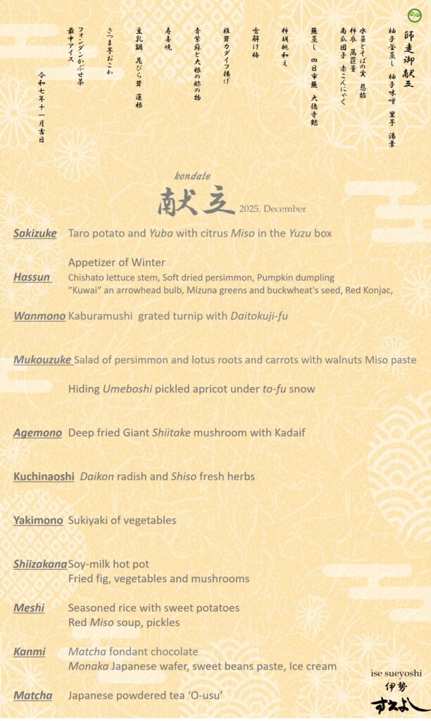 In this moment when winter vegetables, hearty in texture and naturally sweet, warm both body and spirit, it is the finest season for a vegetable-forward (vegetarian/vegan) kaiseki. Yield yourself to the procession of courses and savor the season’s steps as they lead toward year’s end.
